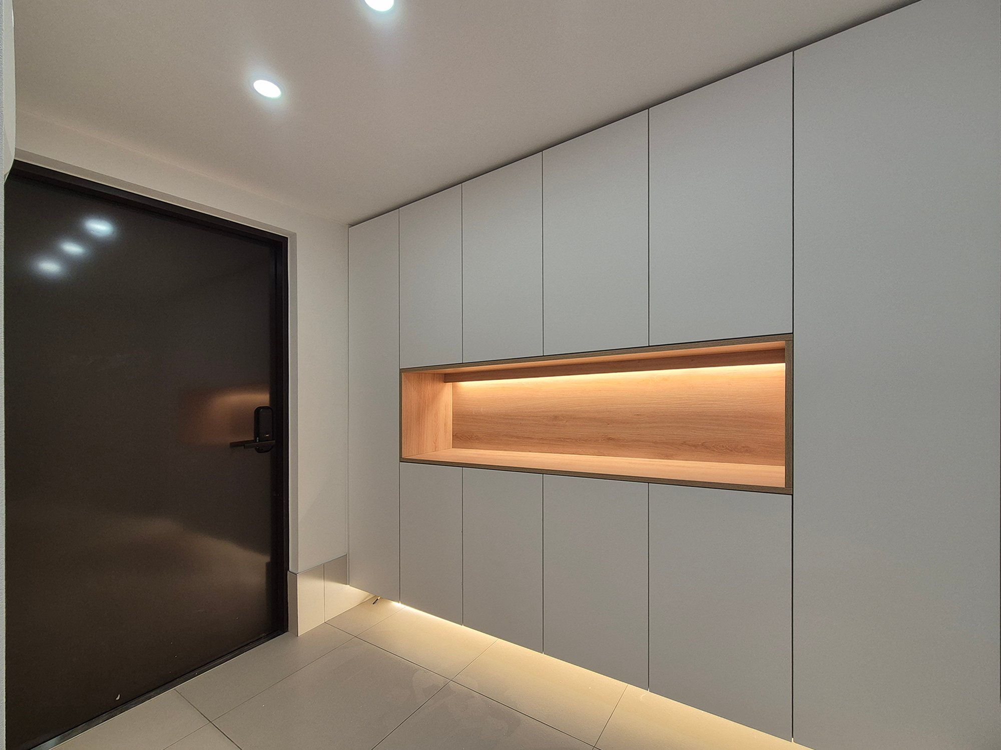 한쪽 벽 전체를 하부 띄움 신발장으로 시공 하였으며 중간이 오픈되어