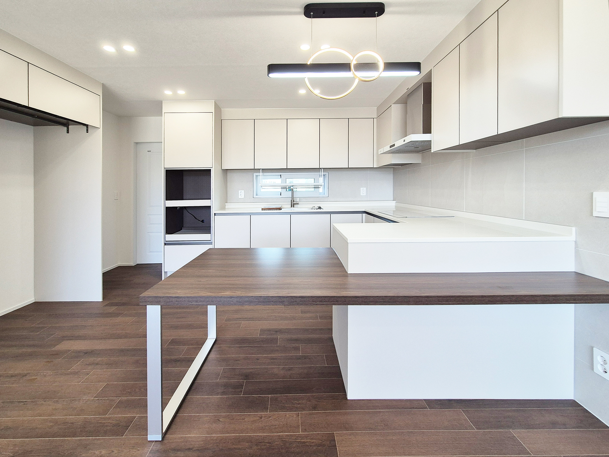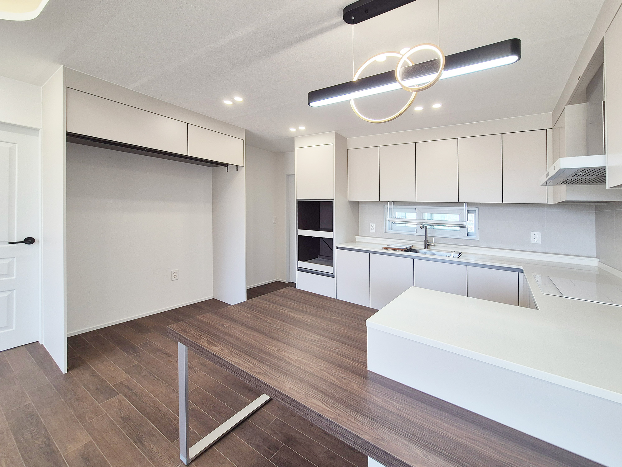 거실과 주방사이를 가로막던 벽체와 미닫이 문을 철거하여 주방을 개방해 공간을 더 넓고 효율적으로 사용할 수 있게 되었습니다. 투톤이었던 싱크대는 화이트톤 싱크대로 교체하여 모던하고 깔끔한 느낌의 주방으로 바뀌었습니다.