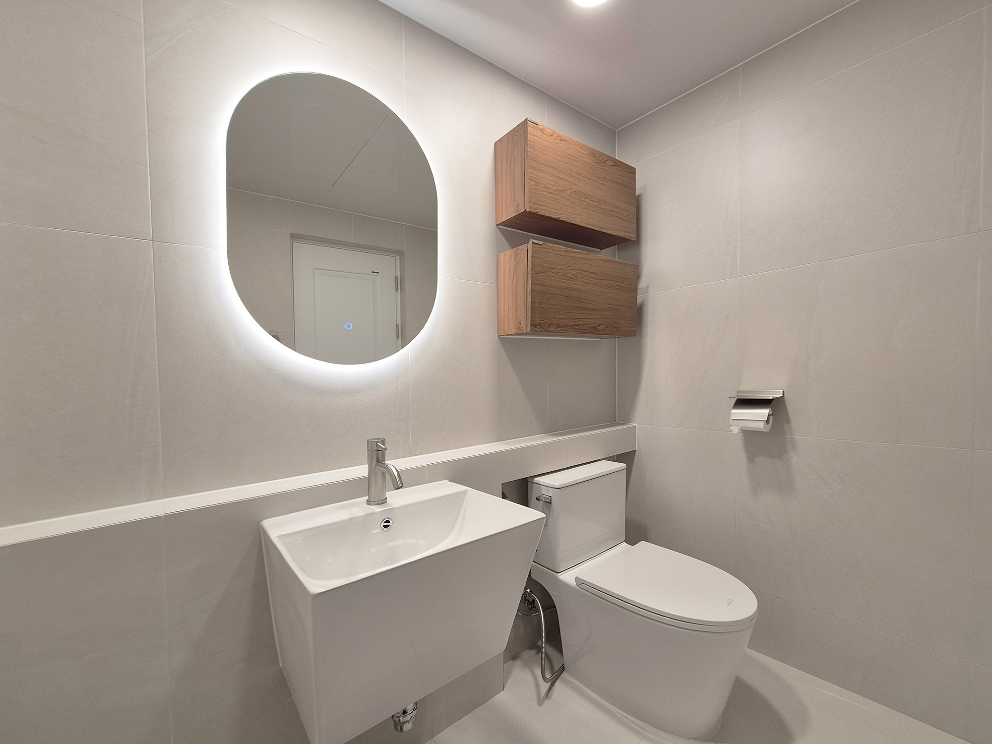 벽과 바닥은 베이지 컬러의 600각 타일과 LED 욕실 거울과 우드 재질의 수납장으로 따뜻한 분위기로