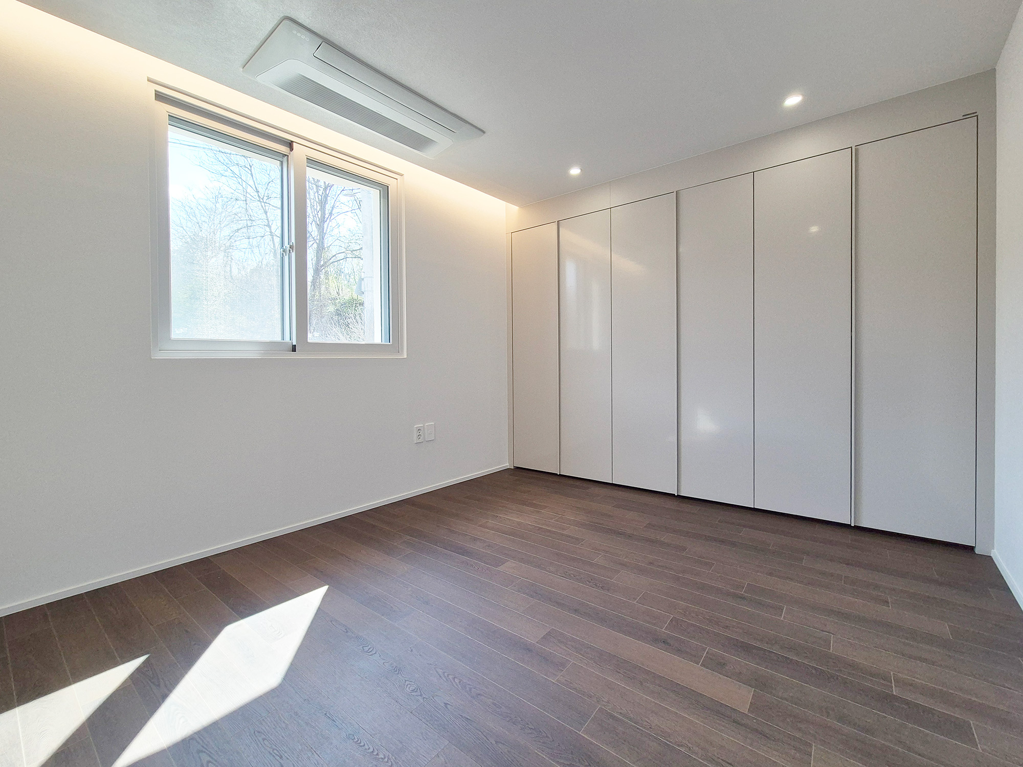 리모델링 이후 불필요한 창문을 줄이고 T5등을 포인트로 시공하여 부족한 밝기를 채웠고 벽은 화이트톤 실크 벽지를, 바닥은 블랙우드컬러의 강마루로 마감하여 은은하고 아늑한 느낌의 안방으로 바뀌었습니다.
