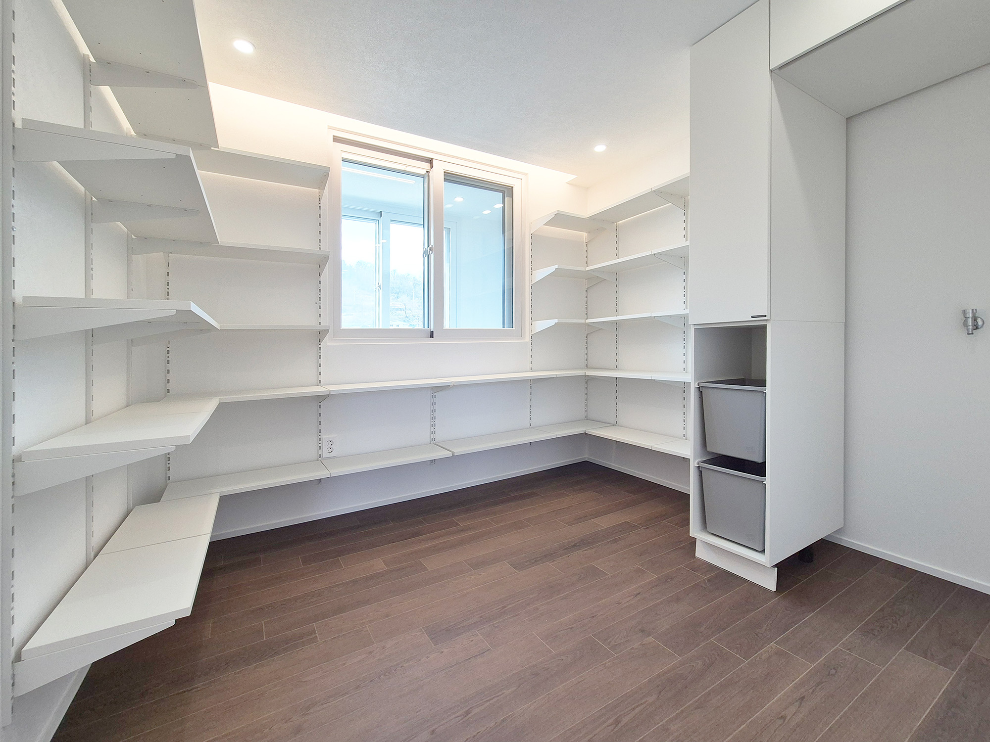 리모델링 이후 팬트리 선반과 세탁기 설치를 위한 키큰장을 시공하여 팬트리룸으로 리모델링 되었습니다. 팬트리 선반으로 효율적인 짐 수납이 가능합니다.